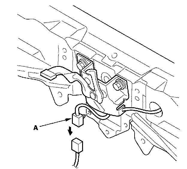 3. Disconnect the hood latch switch connector (A), then remove the connector clip from the body.