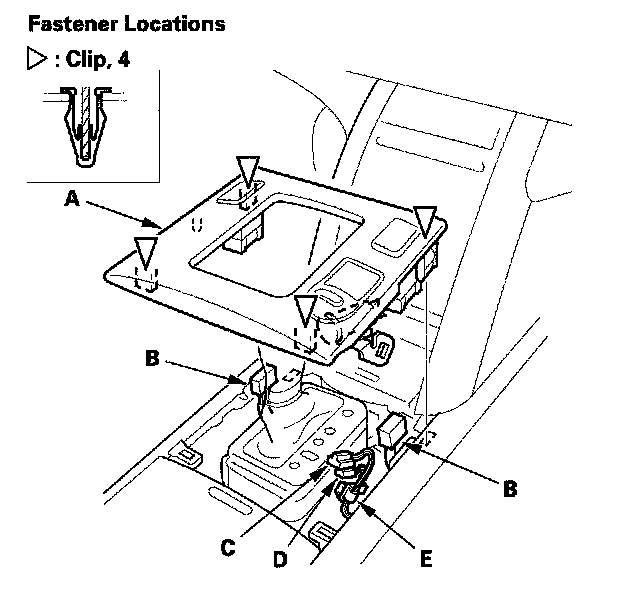 1. Detach the clips by pulling the center console panel (A) up. Disconnect the seat heater switch connectors, or AVS switch connectors (B), accessory socket connector (C), and accessory power socket light connector (D). Detach the harness clip (E).