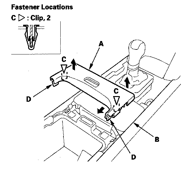 2. Open the beverage holder lid (B), pull the front portion of the trim up by hand to detach the clips (C) and hooks (D), then remove it.