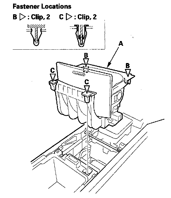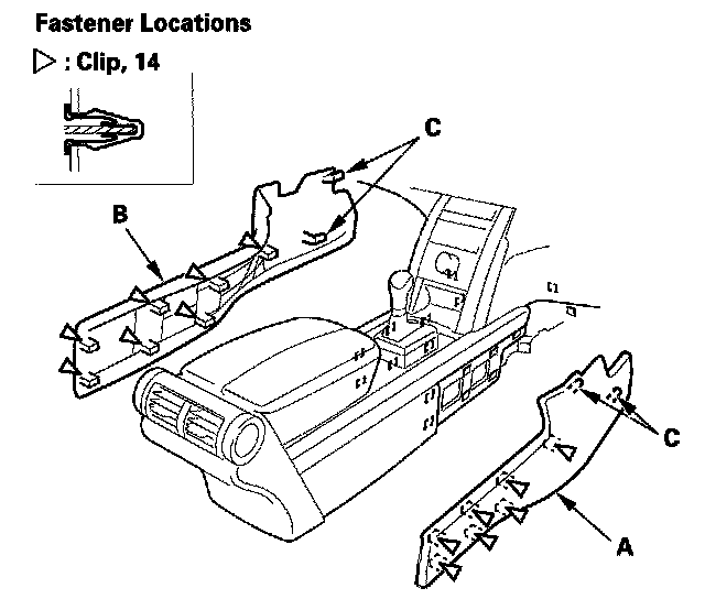 5. Detach the clips by pulling the driver's front console cover (A) and passenger's front console cover (B) out, and pull them backward to release their pins (C) from the heater unit, then remove them.
