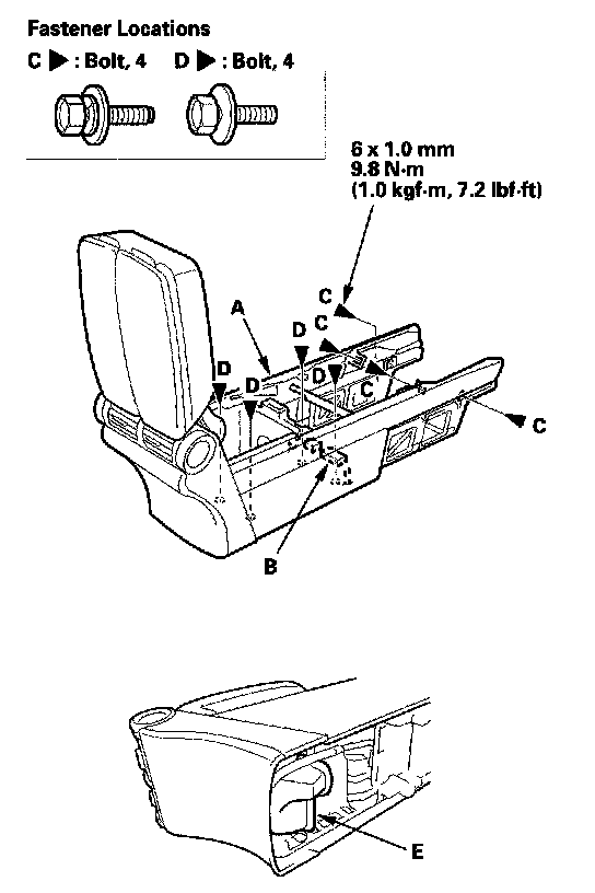 NOTE: Take care not to deform the rear vent duct (E) while removing and storing the console.