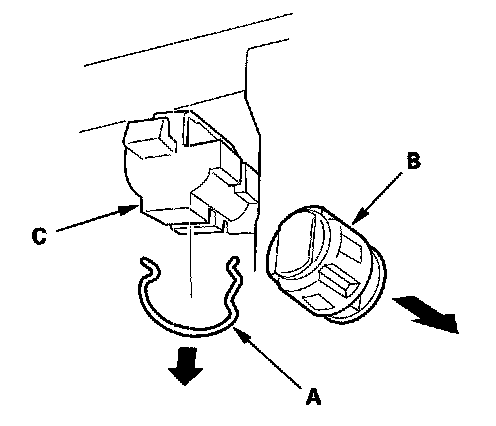 4. Remove the retainer clip (A), then remove the trunk pass-through lid lock cylinder (B) from the lid (C).