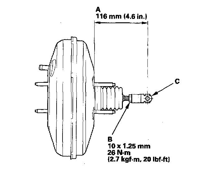 ^ If the booster is removed, check the pushrod length (A) as shown. If the length is incorrect, loosen the pushrod locknut (B), and turn the yoke (C) in or out to adjust, then install the brake booster to the vehicle.