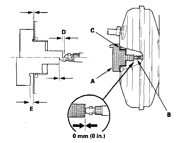 1. Measure the clearance between the plate (A), supplied with master cylinder, and the brake booster pushrod (B). Make sure that the enclosed plate touches contacting surface (C) between the master cylinder and brake booster. If there is a gap between the tip of the plate and the pushrod (D) or a gap between the contacting surface and the plate (E), go to step 2.