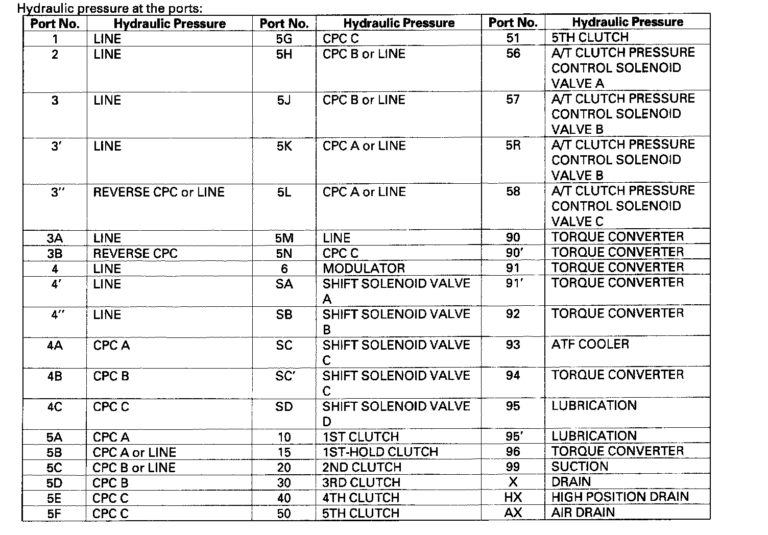 The PCM turns shift solenoid valve A OFF, and shift solenoid valve A covers the port of shift solenoid valve A pressure (SA) to the shift valve A. Shift solenoid valves B and C remain OFF. The shift valve A is moved to the left side to switch the port of line pressure (5B), CPC A pressure (5A) (5L) leading to the 4th clutch, and 3rd clutch pressure (30) releasing 3rd clutch pressure. CPC A pressure (5L) changes to line pressure (5L) and 4th clutch pressure (40) is changed to line pressure mode, and the 4th clutch is engaged with the line pressure mode. The 1st clutch is also engaged, but no power is transmitted because of the one-way clutch.