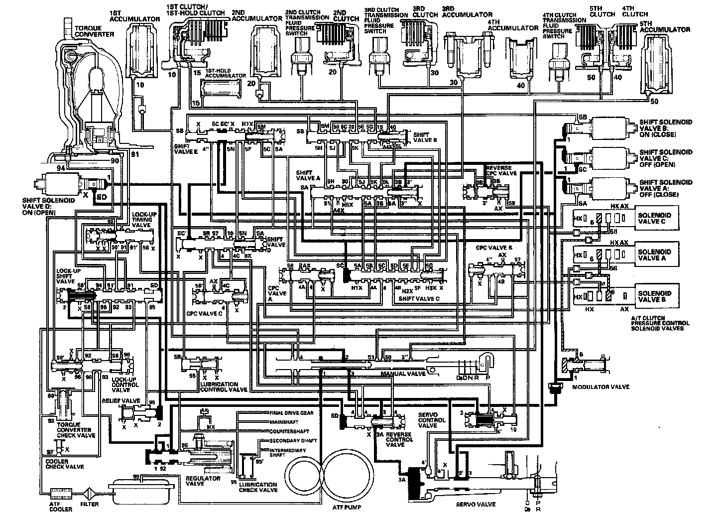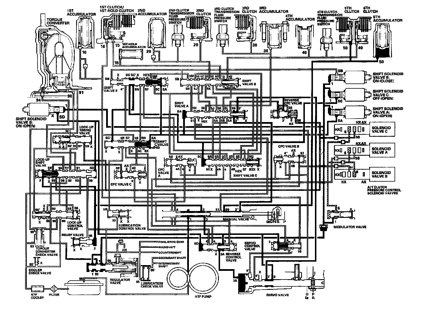 As the speed of the vehicle reaches the programmed value, the PCM turns shift solenoid valve A ON, and shift solenoid valve A uncovers the port of shift solenoid valve A pressure (SA) to the shift valve A. The shift valve A is moved to the right side to switch the port of line pressure (3') and reverse CPC pressure (3B) leading to the 5th clutch. Line pressure (3) flows to the manual valve via the servo valve and shift valve A, and becomes 5th clutch pressure (50) at the manual valve. The 5th clutch pressure (50) flows to the 5th clutch, and the 5th clutch is engaged with the line pressure mode.