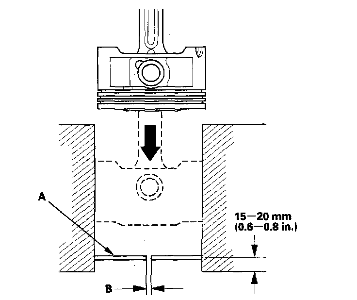 4. Using a piston, push a new ring (A) into the cylinder bore 15 - 20 mm (0.6 - 0.8 inch) from the bottom.