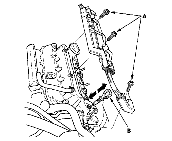 3. Remove the three bolts (A) securing the harness holder, and remove the dipstick (B).