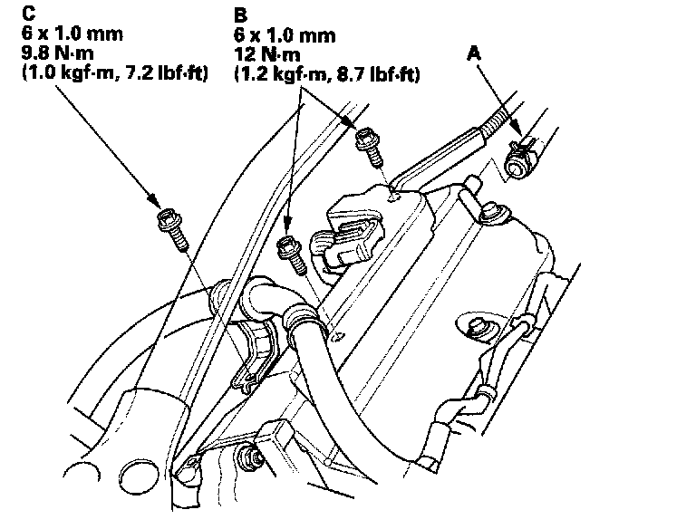 9. Tighten the bolt (C) securing the power steering hose bracket.