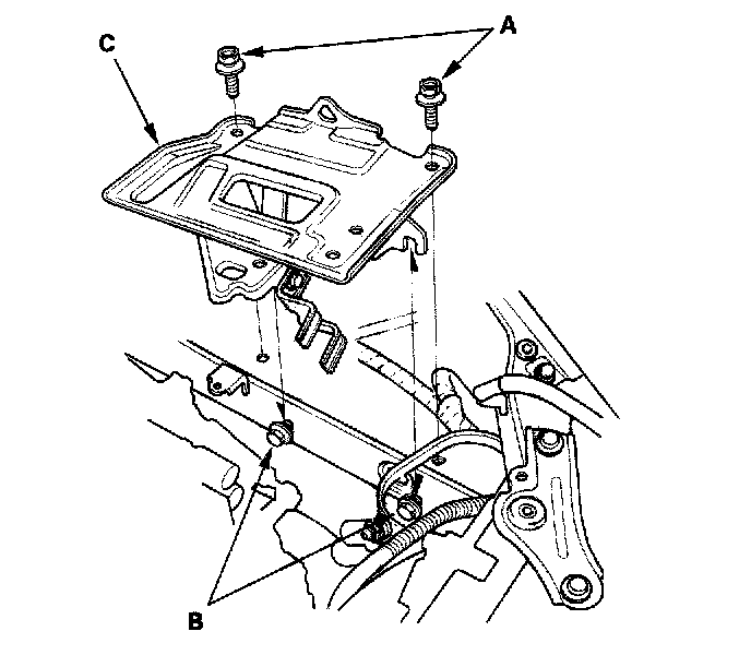 58. Remove the vacuum hose (A) and front mount stop (B), then remove the front mount bolt (C).