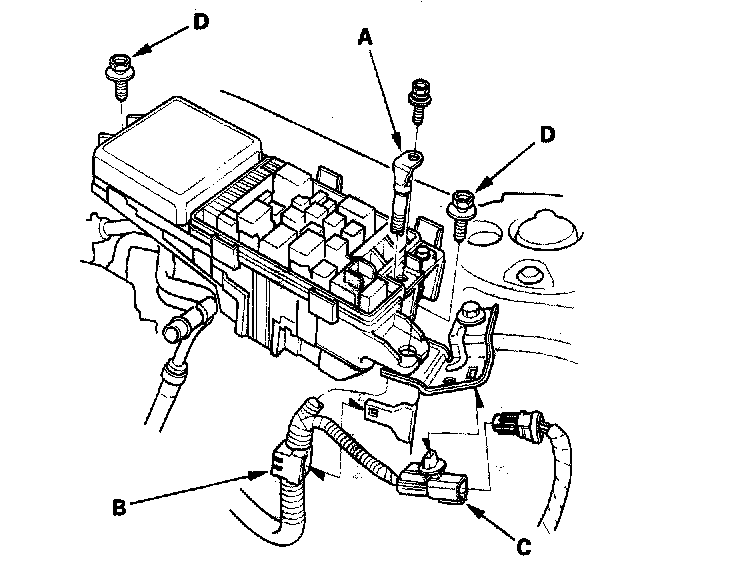 16. Remove the two bolts (D) securing the under-hood fuse/relay box, then remove the under-hood fuse/relay box.