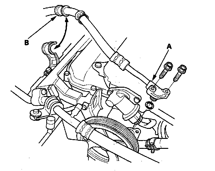 23. Remove the power steering (P/S) pump outlet line (A) from the P/S pump, then plug the outlet line and P/S pump.