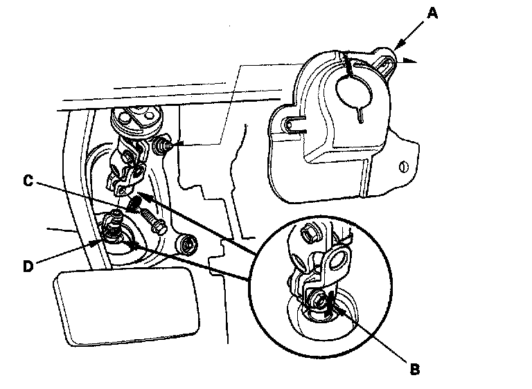 60. Remove the bolt (D) securing the shift cable bracket.