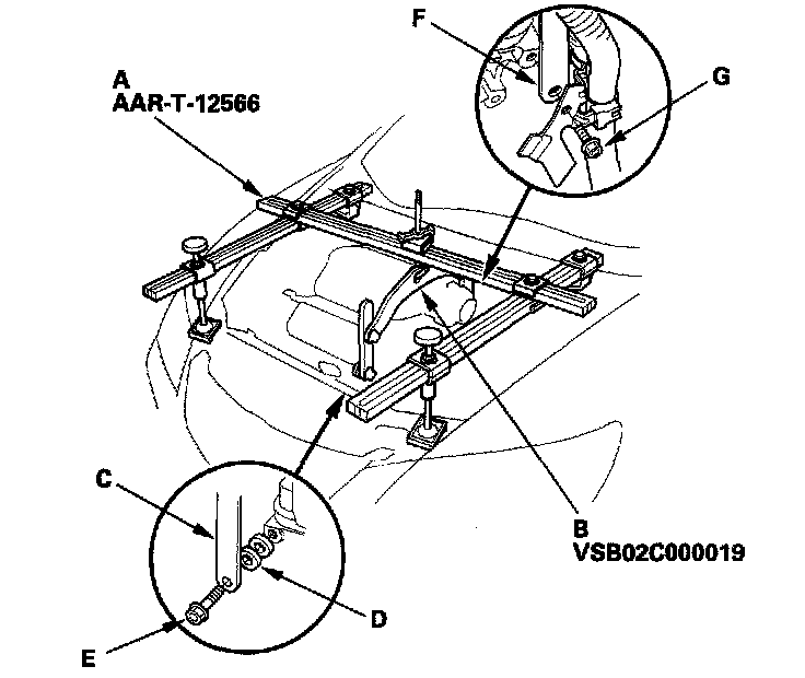 62. Attach the special tool to the subframe by hanging the belt (A) over the front of the subframe (B), then secure the belt with its stop (C).