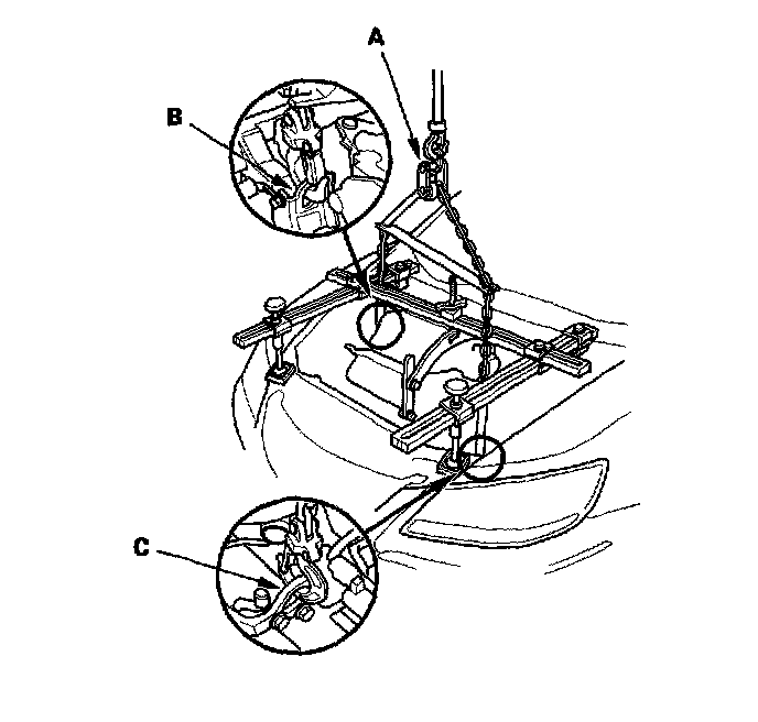 65. Lower the vehicle and attach a chain hoist (A) to the engine hook (B) and transmission hook (C). Lift up on the engine/transmission assembly until it's securely supported by the chain hoist, and remove the engine support hanger from the engine and vehicle.