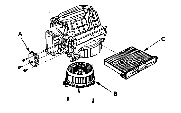 - The recirculation control motor (A) the blower motor (B) and the dust and pollen filter (C) can be replaced without removing the blower unit.