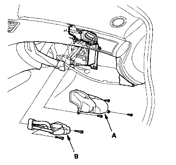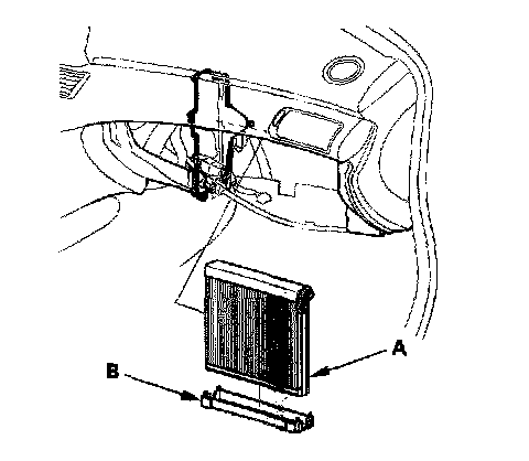 7. Carefully pull out the evaporator core (A) and the plate (B).
