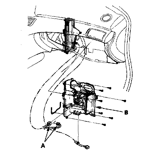 6. Disconnect the connectors (A) from the power transistor and control motor relay, then remove the joint duct (B).