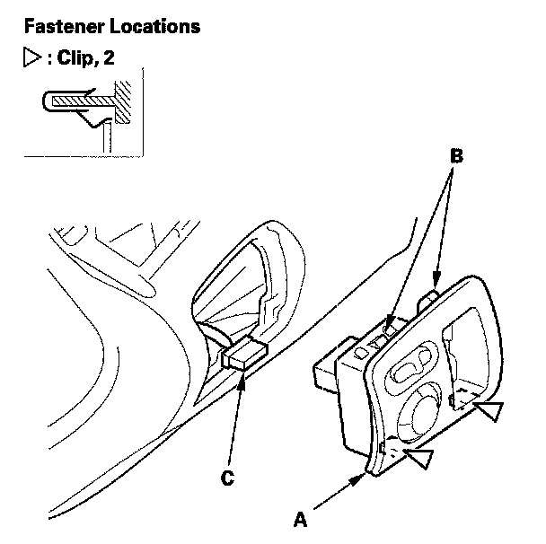 1. Gently pull out the driver's switch panel (A) to release the hooks (B) and detach the clips. Disconnect the power mirror switch connector (C) then remove the panel.