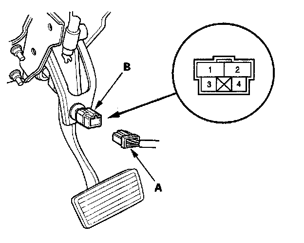 Brake Pedal Position Switch Test1. Disconnect the 4P connector (A) from the brake pedal position switch (B).