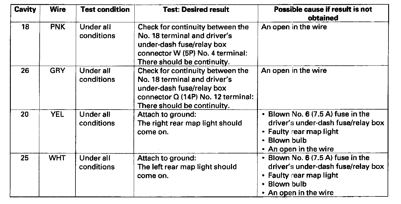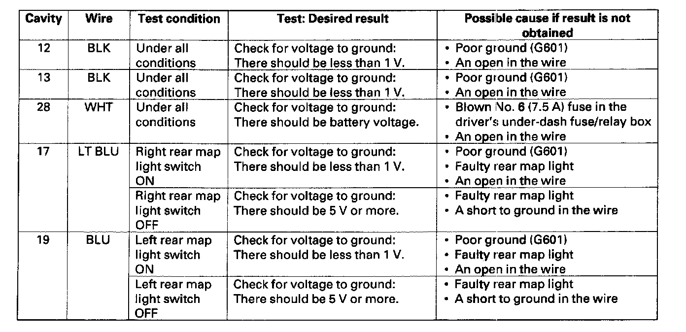 6. Reconnect the connector to the roof console, and make these input tests at the connector.