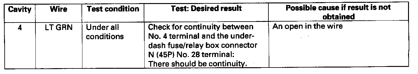 4. Reconnect the connector to the wiper/washer switch, and make these input tests at the connector.