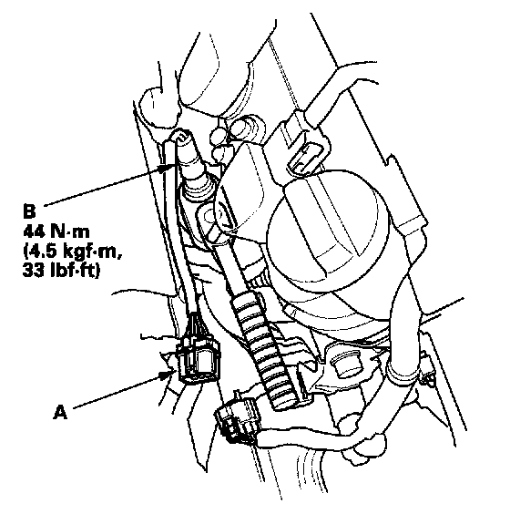 1. Disconnect the front A/F sensor 8P connector (A), then remove the A/F sensor (B) with an O2 sensor socket wrench.
