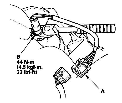 1. Disconnect the rear A/F sensor 8P connector (A), then remove the rear A/F sensor (B) with an O2 sensor socket wrench.