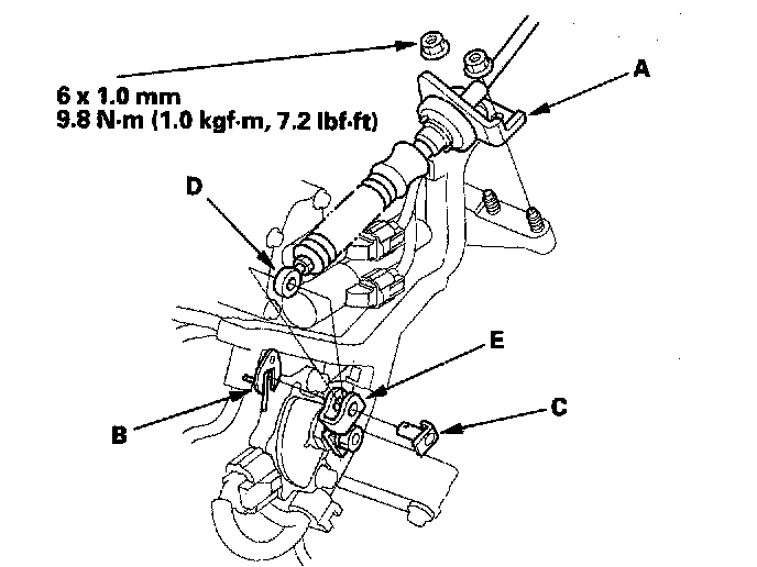 8. Remove the spring clip/washer (B) and control pin (C), then separate the shift cable end (D) from the control lever (E).