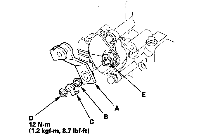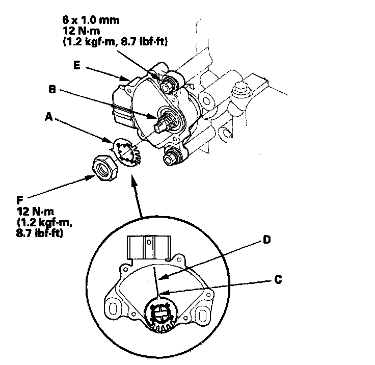 16. Install the new lock washer (A) over the selector control shaft (B) while aligning the projection (C) of the lock washer with the N positioning line (D) on the transmission range switch (E), and install the locknut (F).