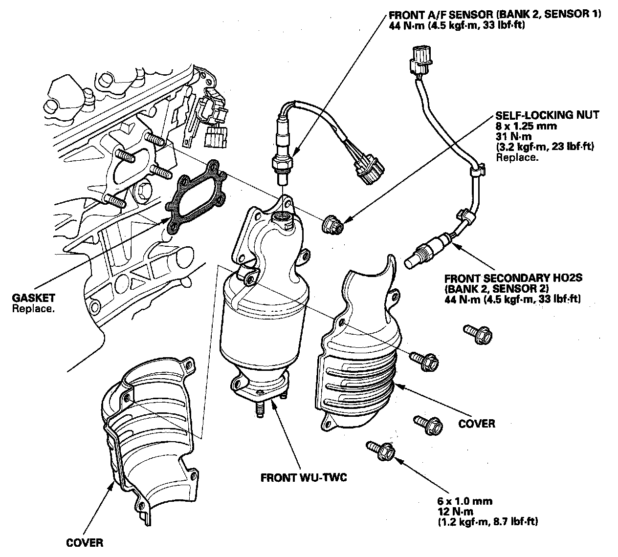 2. Disconnect the front air fuel ratio (A/F) sensor connector and front secondary heated oxygen sensor (secondary HO2S) connector.