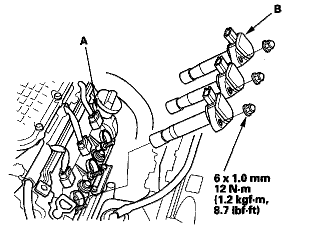 3. Disconnect the ignition coil connectors (A), then remove the rear bank ignition coils (B).