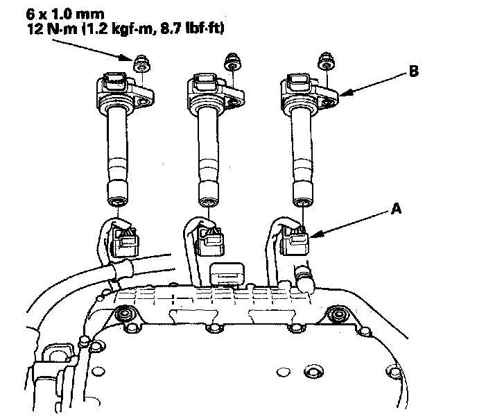 2. Disconnect the ignition coil connectors (A), then remove the front bank ignition coils (B).