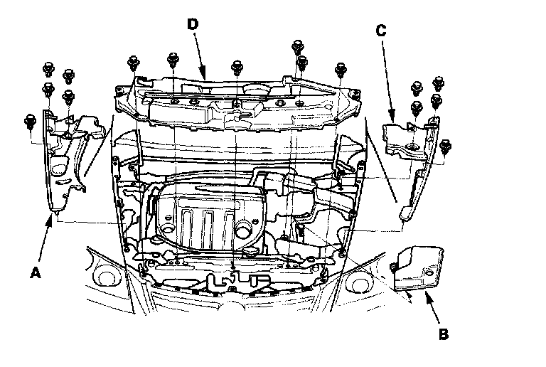 RFC Unit Replacement1. Remove the right upper fender trim (A), battery trim (B), left upper fender trim (C), then remove the upper grille cover (D).