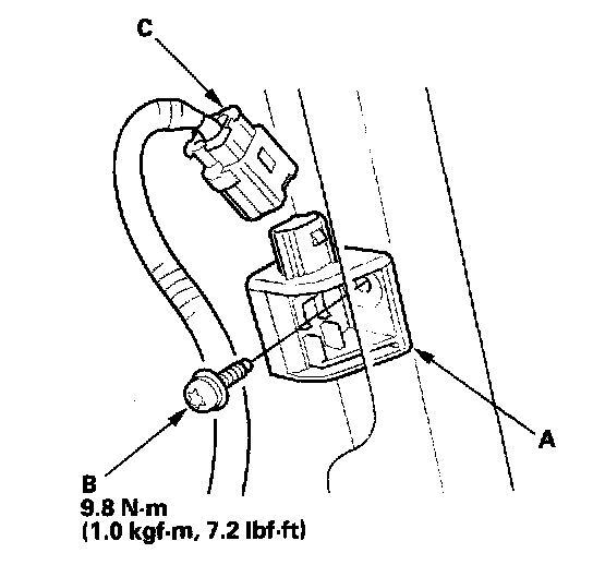 1. Install the new side impact sensor (second) (A) with the Torx bolt (B) then connect the floor wire harness 2P connector (C) to the side impact sensor (second).