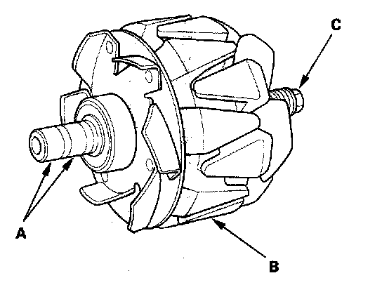 15. Check for continuity between each slip ring and the rotor (B) and the rotor shaft (C).