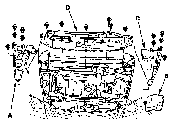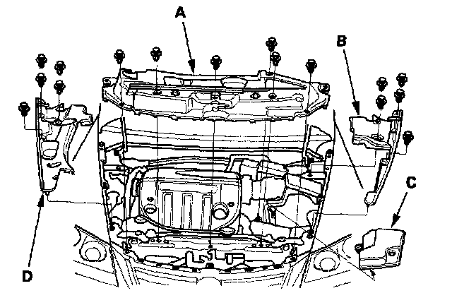 2. Remove the right upper fender trim (A) battery trim (B) left upper fender trim (C), then remove the upper grille cover (D).