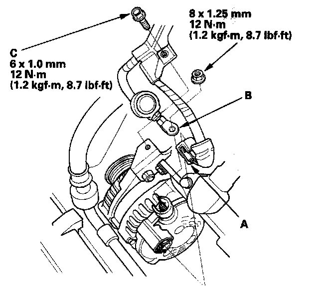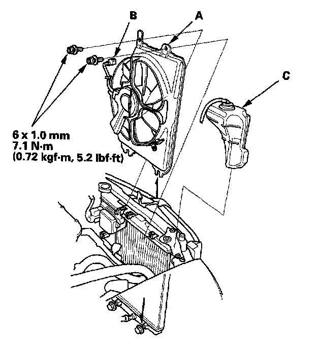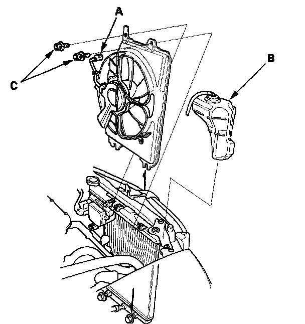 10. Remove the two bolts (C), then remove the A/C condenser fan shroud.