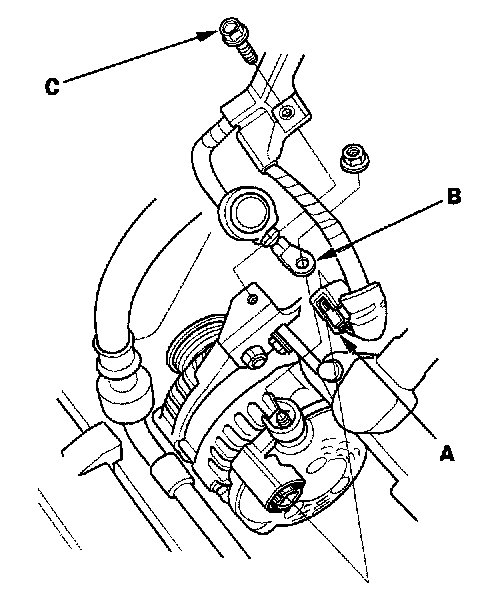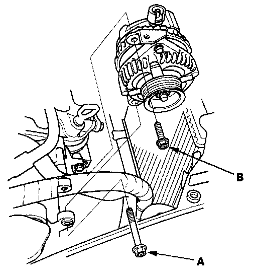 14. Remove the mounting bolt (A), and alternator bracket mounting bolt (B), then remove the alternator.