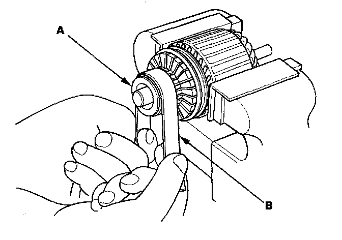 7. Check the commutator (A) surface. If the surface is dirty or burnt, resurface with emery cloth or a lathe within the following specifications, or recondition with #500 or #600 sandpaper (B)
