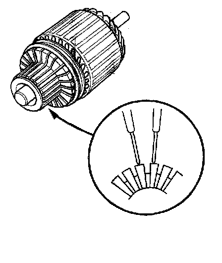 11. Check for continuity between the segments of the commutator. If there is an open circuit between any segments, replace the armature.