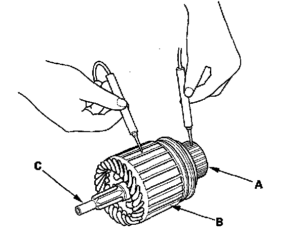 13. Check with an ohmmeter for continuity between the commutator (A) and armature coil core (B), and between the commutator and armature shaft (C). If there is continuity, replace the armature.