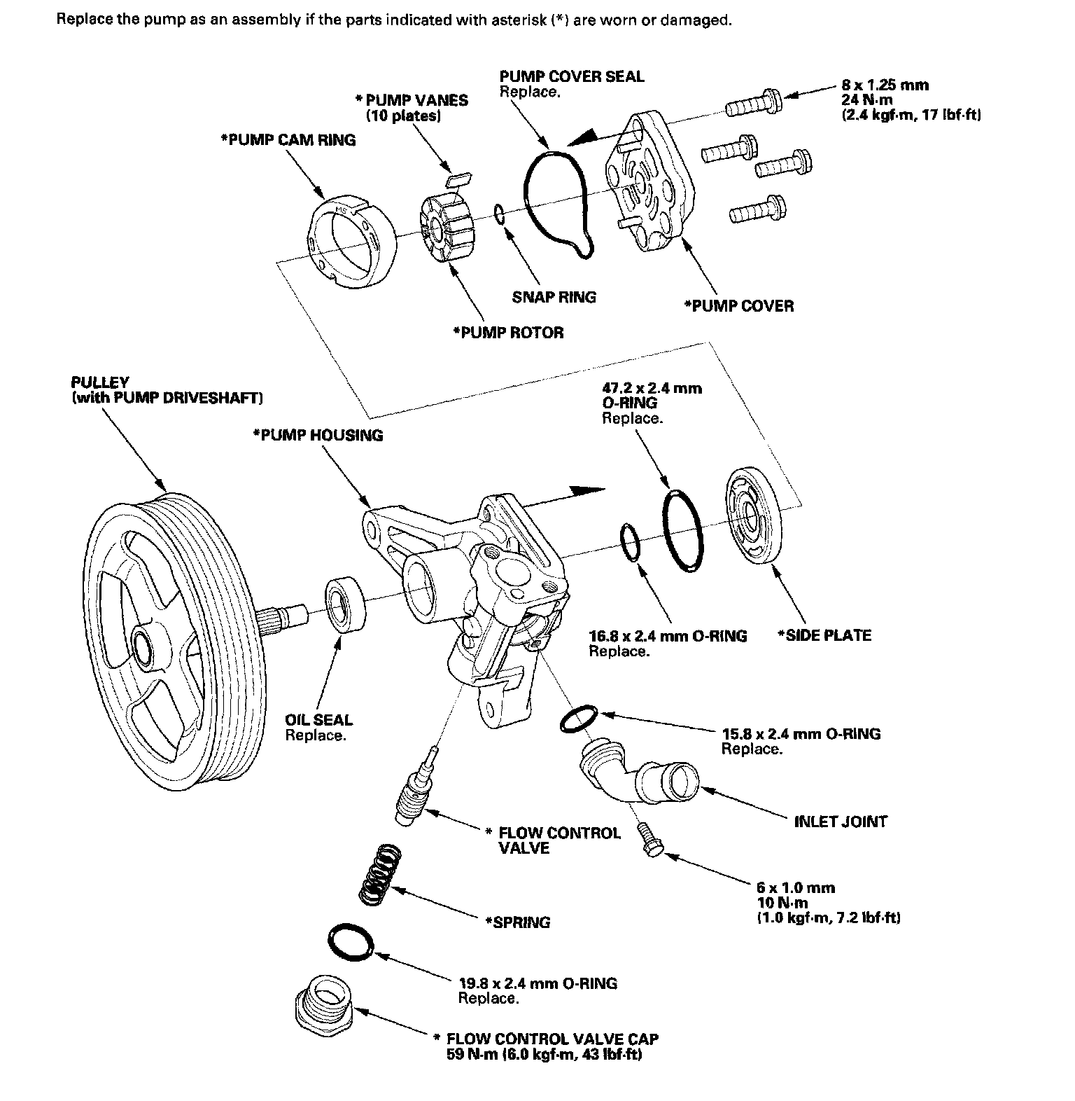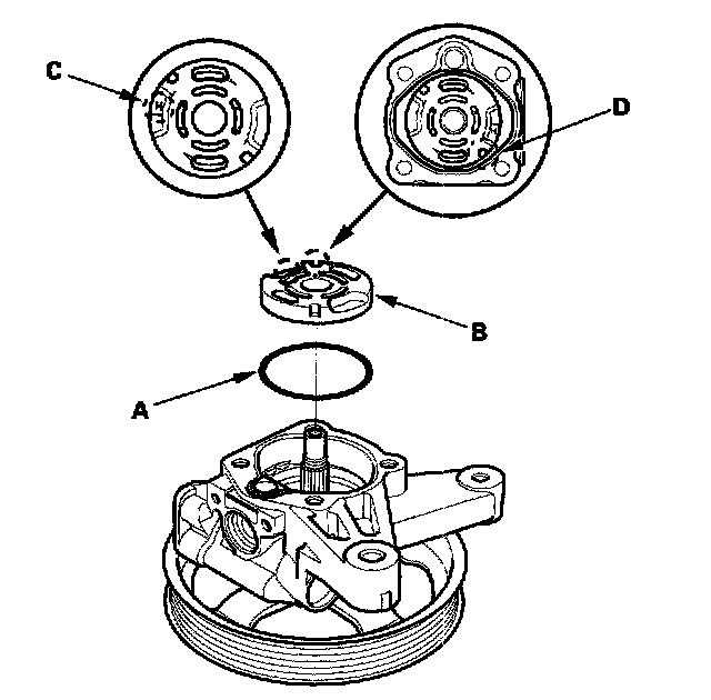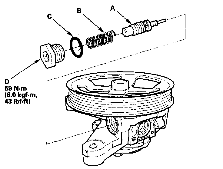 25. Coat the new 19.8 mm O-ring (C) with power steering fluid, and install it on the flow control valve cap (D), then install the cap on the pump housing, and tighten it to the specified torque.
