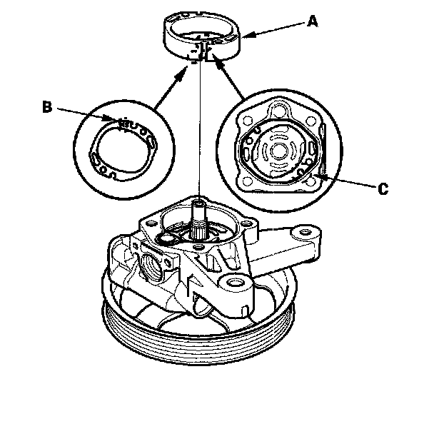 18. Set the pump cam ring (A) with its MS mark (B) facing down, and align the slot (C) in the pump housing.