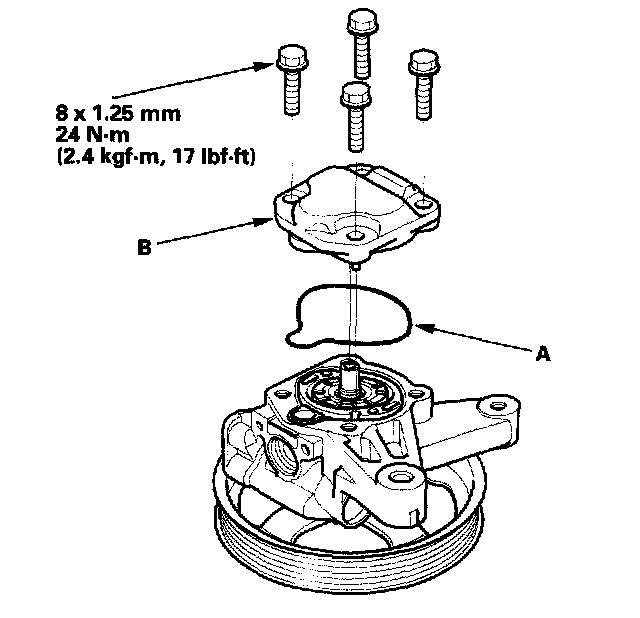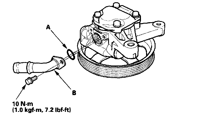 26. Coat the new 15.8 mm O-ring (A) with power steering fluid, and install it on the inlet joint (B). Install the inlet joint on the pump housing.