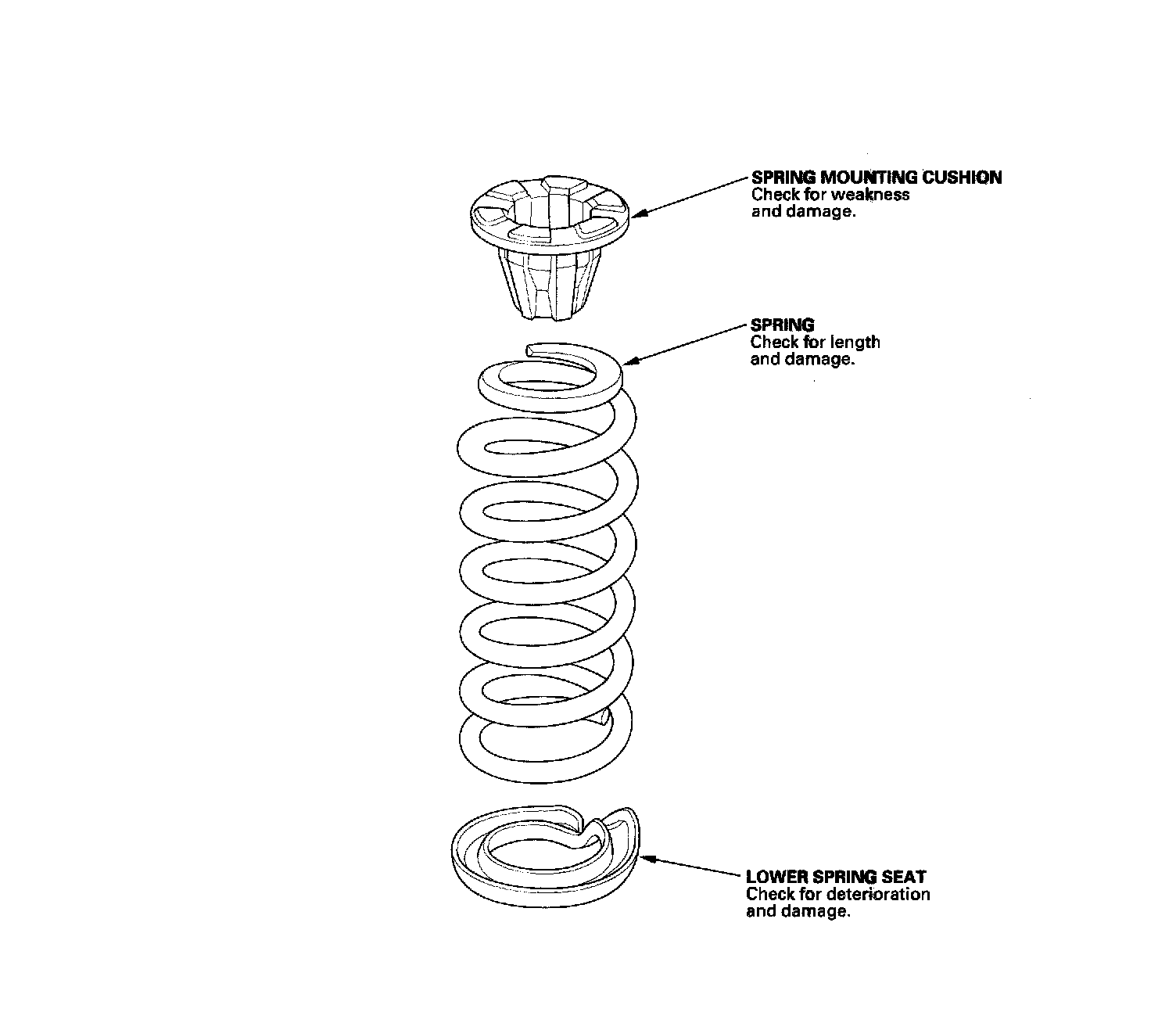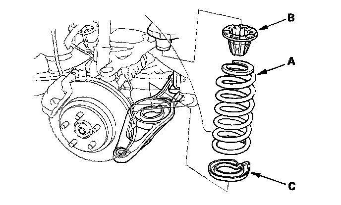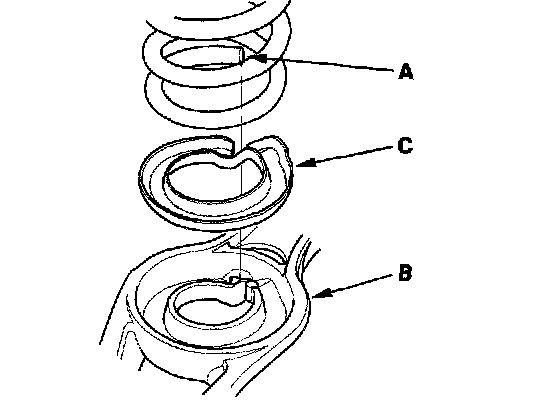 8. Remove the spring (A), spring mounting cushion (B), and lower spring seat (C).