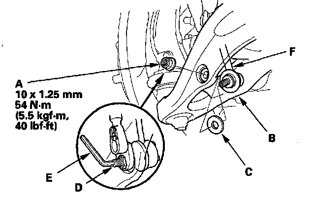 3. Remove the self-locking nut (A) and the washer (C) while holding the joint pin (D) with hex wrench (E), and disconnect the stabilizer link (F) from lower arm B.