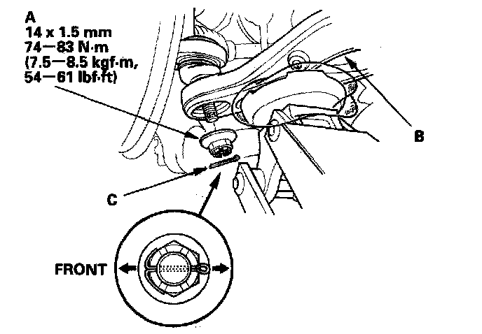 5. Remove the cotter pin (A) from the lower arm B ball joint, and loosen the nut (C).