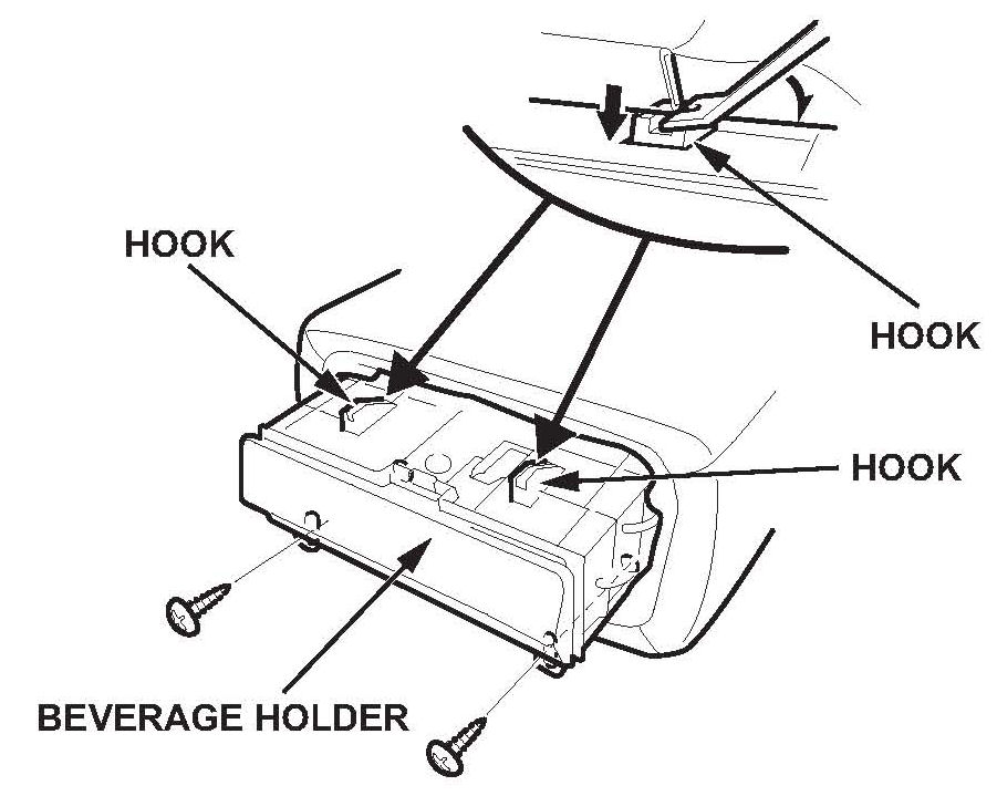 ^ Remove the screws, then pull out the beverage holder to release the hooks.