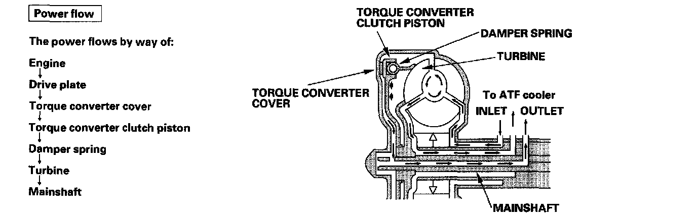 The lock-up mechanism of the torque converter clutch operates in the D position (2nd, 3rd, 4th, and 5th), and D3 position (2nd and 3rd). The pressurized fluid is drained from the back of the torque converter through a fluid passage, causing the torque converter clutch piston to be held against the torque converter cover. As this takes place, the mainshaft rotates at the same speed as the engine crankshaft. Together with the hydraulic control, the PCM optimizes the timing and amount of the lock-up mechanism. When shift solenoid valve D is turned on by the PCM, shift solenoid valve D pressure switches the lock-up shift valve lock-up on and off. The A/T clutch pressure control solenoid valve C, the lock-up control valve, and lock-up timing valve control the amount of lock-up.